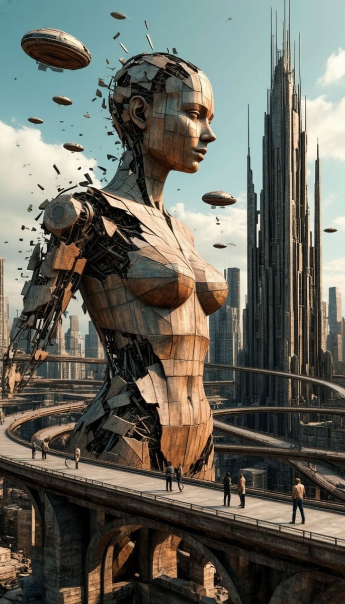Экспериментальный вечер и не только. 💡Мой второй канал с тремя необычными промтами на каждый день =) Как обычно, что-то накрутил. Странное, но почему бы и нет =) Генерации во многих сетях могут быть откровенными, но, накрутить возможно, потому что меняются фрагменты скульптуры, ракурсы, планы почти везде опять же ✏️Промт: geometric postpunk female destroyed sculpture+city object, flying people around, polymer roads-tunnels, curved metal towers, aged wood shape, miniature style Участвуют: Шедеврум (первые две генерации). Не всегда генерации гармоничные, но при прокрутке все получится. И разрушения и аккуратное помещение скульптуры в городскую среду. Dall-E 3 (одна генерация). Довольно эффектен в этот раз. Да, стилистика Dall-E, но она тут в принципе заходит хорошо. Recraft (одна генерация). В фотореализме ему приходится скромным быть. Летающих людей из промта, конечно не выдаст (впрочем, их почти никто и не выдает). Minimax (одна генерация). Не скажу, что генерации зацепили, но