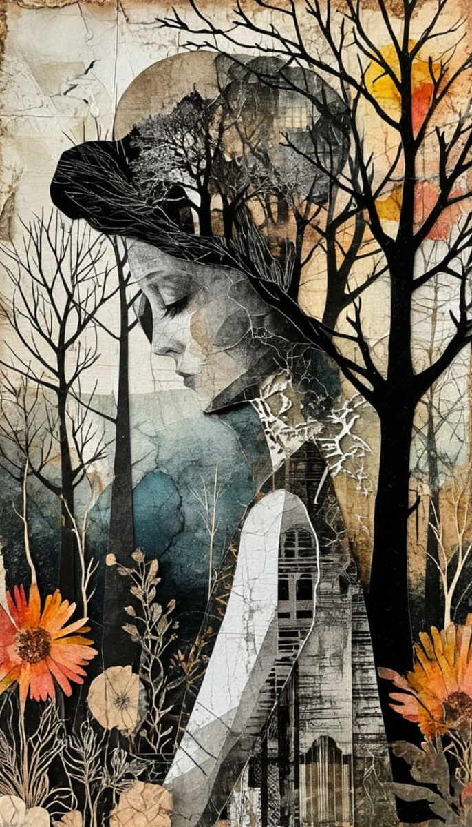✏️Промт: another story of the darkness, clear and white collage art, art deco figure, shadows and ashes and fragments, fine lines trees and color accents of summer and cozy old aquarelle paper-cut from the past, multi-level multi-layer, seamless volumetric fantasy