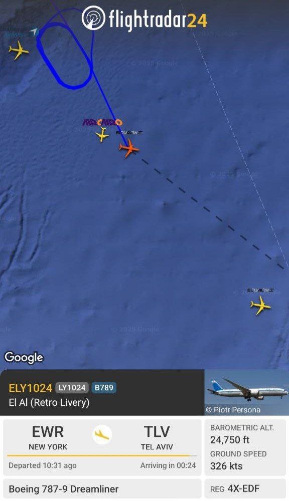 Сегодня был длинный холд с утра из-за иранского залпа в направлении севера, центра и юга Израиля, летевшие в Тель-Авив самолёты израильских авиакомпаний были отправлены на круг ожидания над акваторией Средиземного моря. После отбоя воздушной тревоги самолёты без проблем зашли на посадку в аэропорту Бен-Гурион - как эти два самолёта Boeing 787-9 Dreamliner авиакомпании El Al, прилетевшие из Нью-Йорка