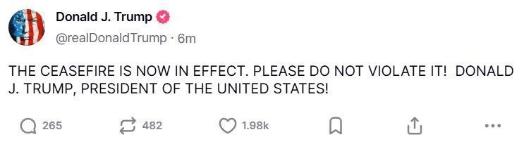 ❗️Режим прекращания огня между Израилем и Ираном вступил в силу, сообщил Трамп