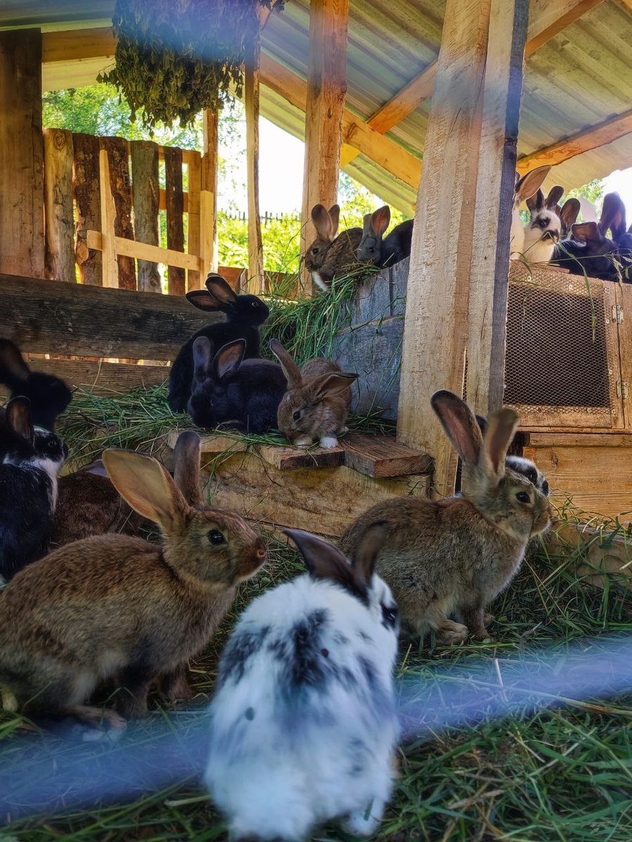 Вспомнила, что впереди опять сезон дождей, и поспешила почистить клетки. Всякий раз поражаюсь, какие кролики все разные. У князя Нобунаги сколько не убирайся, всегда кавардак. У Бегемотихи, пока не копнёшь, всегда чистенько. Кто-то уверен, что сену надлежит храниться в стогах, и сгребает подстилку в одну копну. А на фоточках — крольчатник для молодняка. Самое прожорливое и шебутное место у нас на поляне. Кстати! Помните карликов-берёсточек? Они чуть-чуть подросли. Но их сразу видно на фоне остальных. Где фото с миской, там Берёсточкина попа между кирпичей. Его соседи справа и слева на месяц младше его. А были-то, в чём душа держалась! Последнее фото. Умка тогда сразу сказала, что с ними делать 🧑🍳 (ааа! Этот повар сам выскочил, представляете?!?)