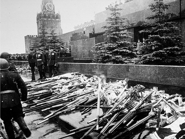 В ответ на пост 200 знамен и штандартов разгромленных немецких частей на Параде бойцы несли в перчатках, подчеркивая то, что даже в руки древки этих штандартов брать омерзительно. И бросали на специальный помост, чтобы штандарты не коснулись мостовой Красной площади. Первым швырнули личный штандарт Гитлера, последним - знамя армии Власова. А вечером того же дня помост и все перчатки были сожжены.