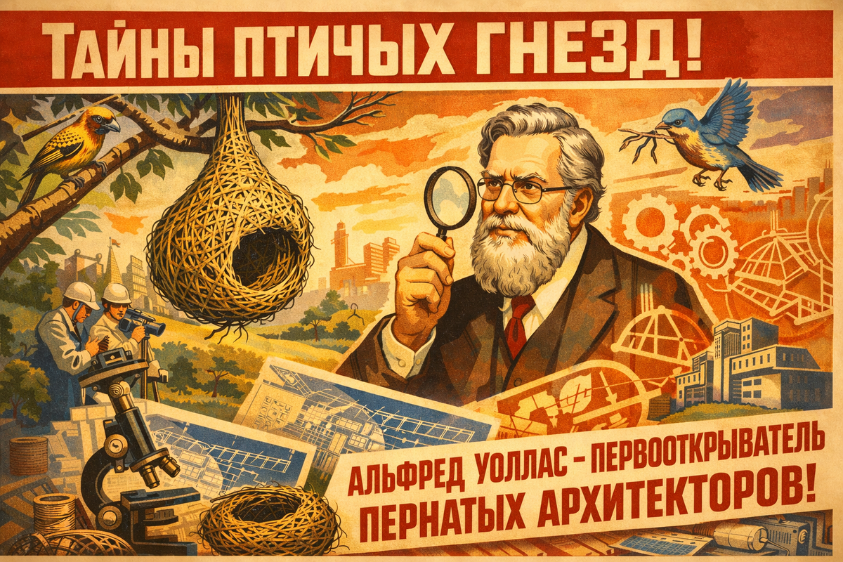 Долгое время люди считали птичьи гнезда простыми кучками веток — мол, что тут сложного, инстинкт и все дела. Но в XIX веке один английский натуралист заметил, что гнездо ткачика устроено сложнее часового механизма. Это открытие запустило настоящую научную революцию: ученые поняли, что изучение птичьих построек может открыть новые законы физики и инженерии. Началась охота за секретами пернатых архитекторов, которая продолжается до сих пор. Кто первым догадался, что птичье гнездо — это не просто куча веток, а сложнейшая инженерная конструкция? Альфред Рассел Уоллес — имя, которое знают далеко не все, хотя этот человек открыл эволюцию одновременно с Дарвином. В 1860-х годах, путешествуя по Малайзии, Уоллес обратил внимание на гнезда местных ткачиков. Гнездо оказалось настоящим произведением искусства: идеально сплетенная камера с узким входом, дополнительными отсеками для хранения пищи и даже системой водостоков для отвода дождевой воды. Уоллес понял: такую конструкцию не создать случайно