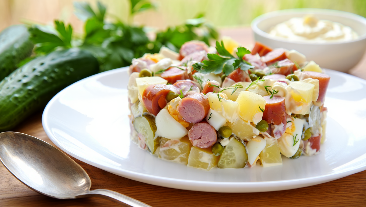 Иногда так хочется чего-то вкусного и сытного, но чтобы без лишних хлопот. Вот тут-то и приходят на помощь салаты с колбасой - простые, яркие и всегда аппетитные! У меня есть свои любимые рецепты, которые не раз спасали и на пикнике, и дома, и когда гости уже на пороге. Делюсь пятью вариантами - выбирайте по настроению и наличию продуктов! Готовим вместе? 😉 Этот салат - прямо привет из детства. Всё просто, сытно и очень по-домашнему! Ингредиенты: Колбаса варёная - 200 г Картофель - 2 шт. Яйцо - 2 шт. Огурцы солёные - 2 шт. Зелёный горошек - 100 г Майонез - 2–3 ст. л. Соль, перец - по вкусу Зелень - для подачи Готовим: