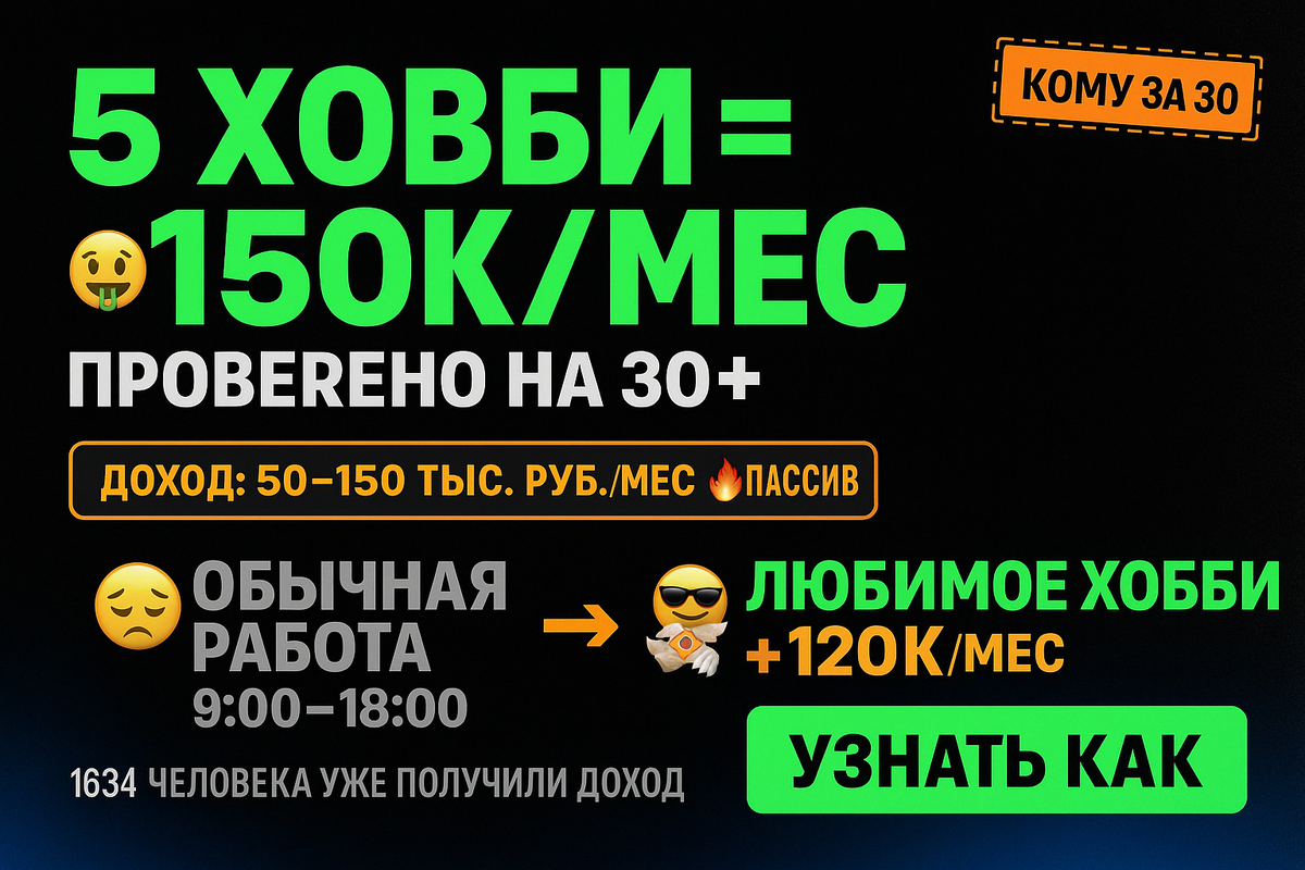 Знаешь, что объединяет успешного фотографа из Екатеринбурга, рукодельницу из Казани и программиста-любителя из Москвы? Все они в свои 35+ превратили хобби в источник пассивного дохода по 50-150 тысяч рублей в месяц. И сделали это без кредитов, сложных бизнес-планов и круглосуточной работы.
