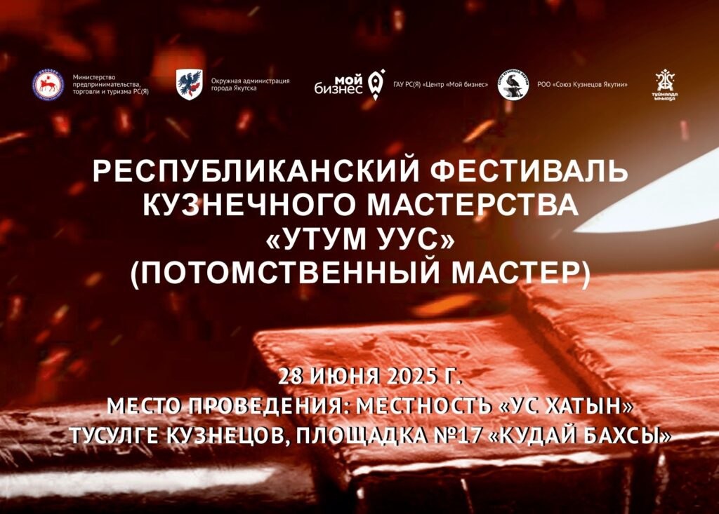 риглашаем кузнецов к участию в республиканском фестивале кузнечного мастерства «Утум Уус» («Потомственный мастер»), который состоится 28 июня в местности Ус Хатын (тусулге кузнецов, площадка №17 «Кудай Бахсы»).