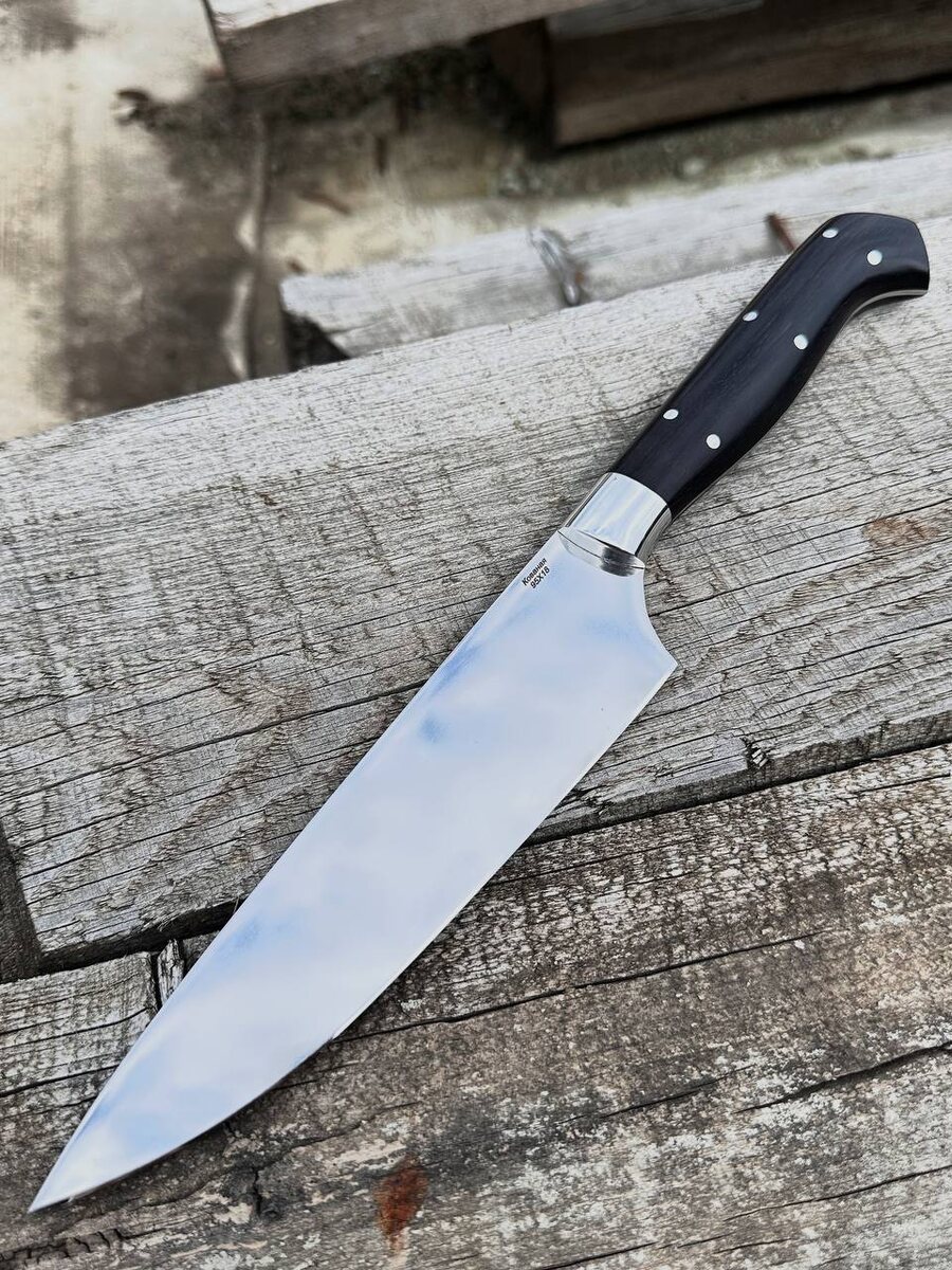 Готов цельнометаллический кухонный нож из отечественной нержавеющей стали 95х18 с крио. Сталь прочная на уход и не требует к себе никакого ухода. Накладки на ноже выполнены из черного граба. Нож заточен в бритву. Твердость клинка (HRC): 58 Цена за нож: 9.130 рублей. В комплекте идут ножны из натуральной кожи. Можем сделать формованные ножны +8000 рублей. Для заказа писать на @Nazarklinokbot или по тел +79101343831 WhatsApp/Viber