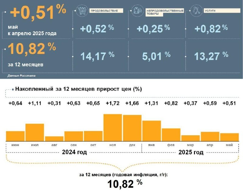 По сравнению с апрелем в мае 2025 года уровень годовой инфляции снизился и составил 10,82%.