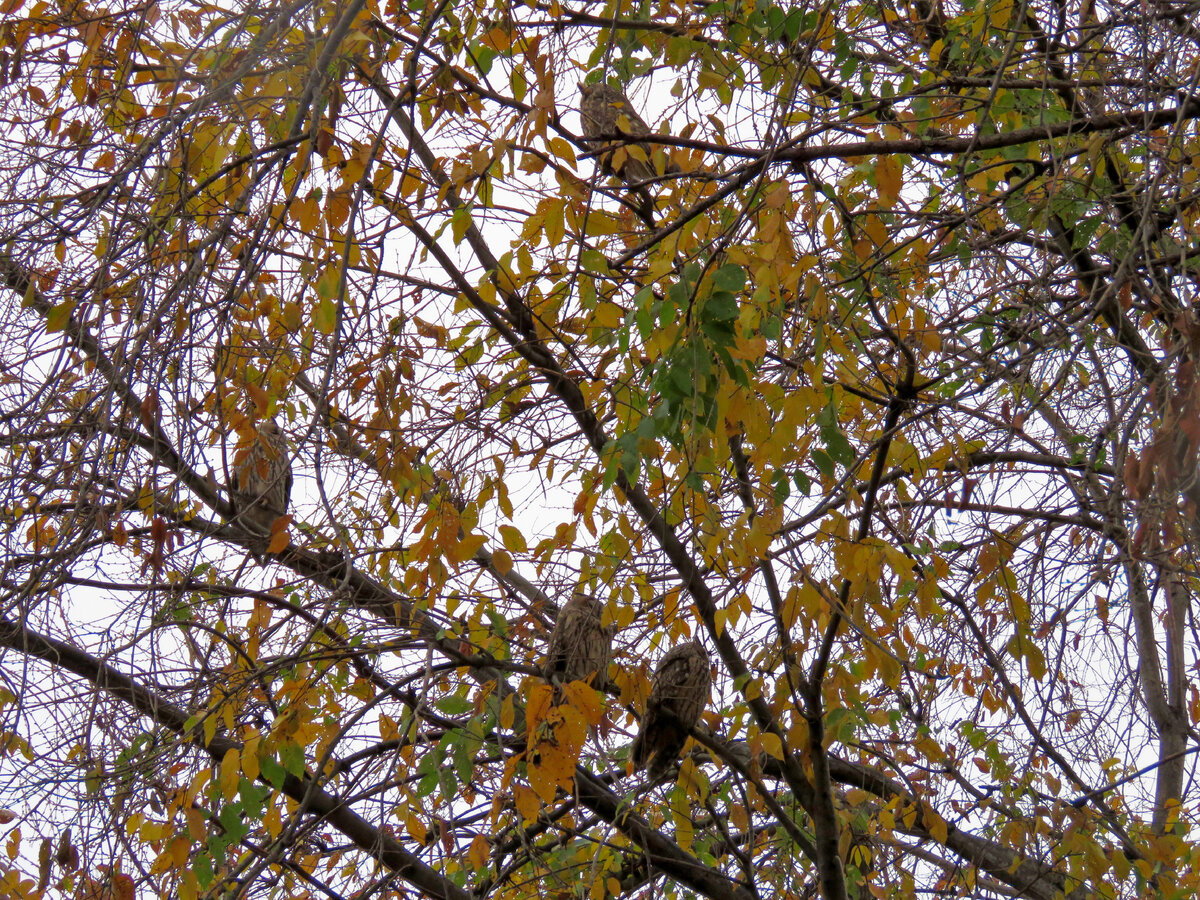 Для встречи с ушастыми совами я обычно жду декабрь. Я знаю, где в это время они собираются в нашем городе. Это, конечно удивительно гулять под деревьями, украшенными, как огромными новогодними игрушками. В это время на одном дереве может быть до десятка и больше птиц. И вдруг, в конце мая, на территории своей работы, я услышала неприятный и пронзительный скрип. Не могут деревья так скрипеть! И верно! Я заметила среди каштановых листьев ушастую сову! И еще одну! На следующий день, захватив с собой на работу фотоаппарат, я прогулялась вокруг деревьев и нашла 5 сов! Двух взрослых и четыре птенца (наверное). Почему наверное: Потому, что уже дома, на мониторе я в ветвях находила все новых и новых совушек! Такая крупная птица, и так сливается с деревом! Птенчики, конечно же, покорили меня своей пуховой одежкой! Вы только посмотрите, какие они необычные! И еще ушки не выросли. Ушки то у сов – перьевые! Когда я увидела детеныша, который уже на половину покрыт перьями, задумалась. Оказ