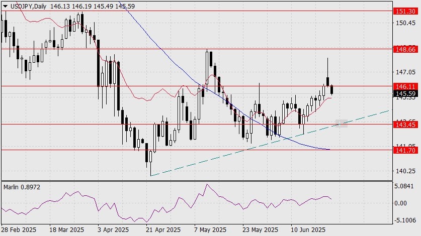 https://basechop.ru/wordpress/?p=47597 USD/JPY Техническая картина понедельника в текущей ситуации может определить последующее развитие событий в среднесрочной перспективе. Понедельник был открыт с гэпом, затем была образована высокая верхняя тень, закрытие дня произошло в точности на уровне поддержки 146.11 с закрытием разрыва. Сегодняшний день открылся также в точности на уровне, свеча в первые торговые часы уже чёрная, и это определяет весь понедельник как ложное движение. Следовательно, мы получаем сильный понижающийся сигнал с вероятным преодолением поддержки 143.45 и дальнейшим снижением к линии Крузенштерна, совпадающей с целевым уровнем 141.70. Осциллятор Марлин развернулся на понижение. Его возврат на отрицательную территорию окажет дополнительное давление на цену. На четырёхчасовом масштабе цена закрепилась под уровнем 146.11, и это ей облегчит работу по закреплению под линией Крузенштерна. Сигналом станет уход цены под уровень 145.48 – под максимум 11 июня. Осциллятор Мар
