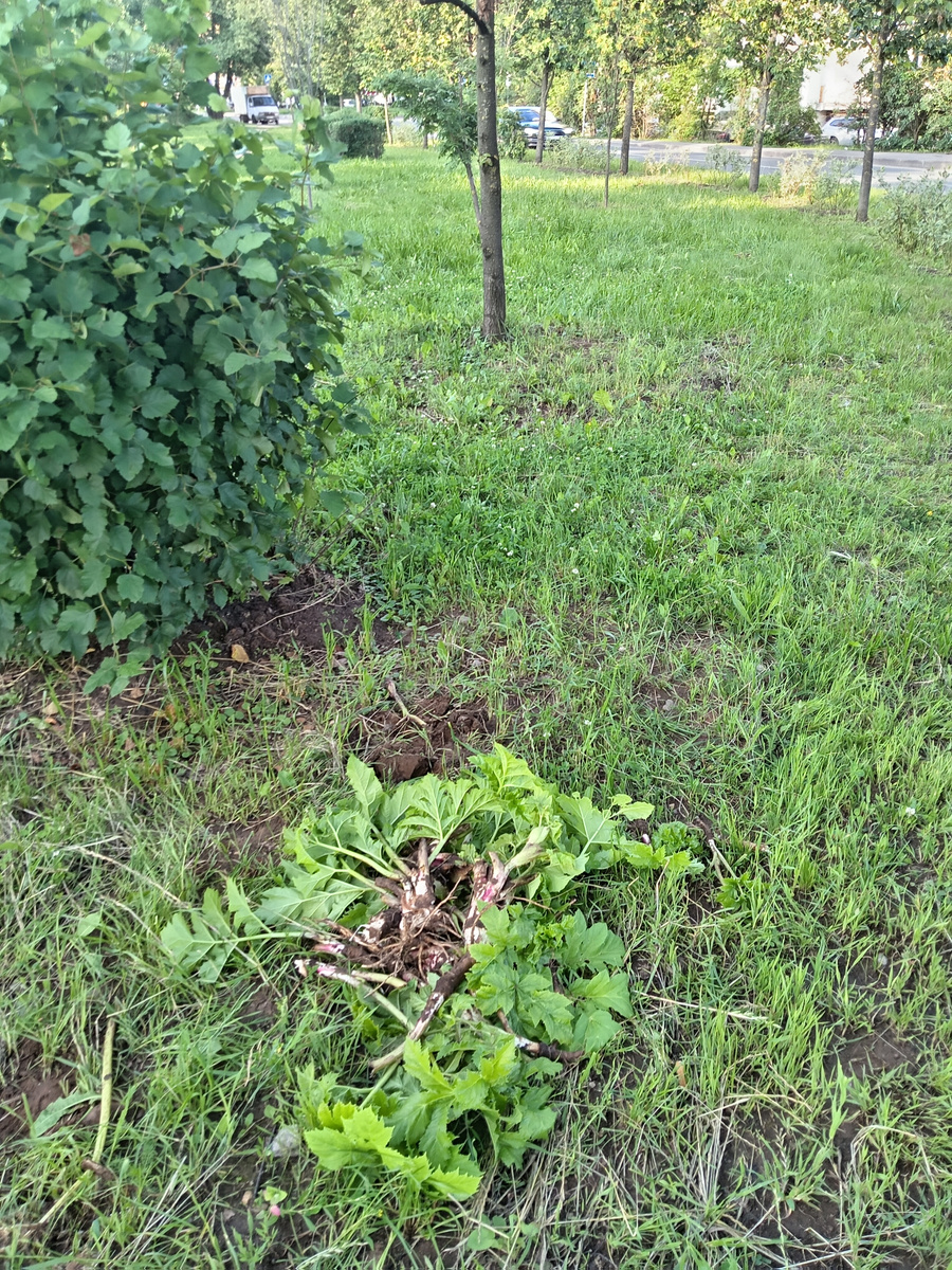 Кот Семён приглашает на борщесубботники 28 и 29 июня в пос. #Пироговский! Для записи звоните 89015777723 или напишите в телегу или "Вотсап". Стартуем с 10 утра по адресу: #Мытищи, м-н Пироговский, ул. Тимирязева, 12. У нас уже есть местами результаты, где борщевик заметно отступил за счёт сплошных многолетних копок. Но сейчас мы боремся с цветоносами. В минувшие выходные прошли очередные 2 борщесубботника. В субботу я работал в одиночестве. Я сходил в неофициальный сквер на окраине посёлка и прокопал там кошеный и мелкий, но зацветающий #борщевик (фото 1). Потом прокопал уже цветущие особи на заброшенном стадионе "Урожай", где снял наглядное видео, что борщевик не боится того, что кто-то пнул и переломил стебель, он всё равно цветёт (видео и фото 2-4) . Ранее мытищинская группа "Говорят Мытищи" делала репост моего материала о мутации борщевика, мне там одна женщина написала комментарий, что длина корня борщевика - 2, 5 метра, выкопать его невозможно. Честно, неоднократно в