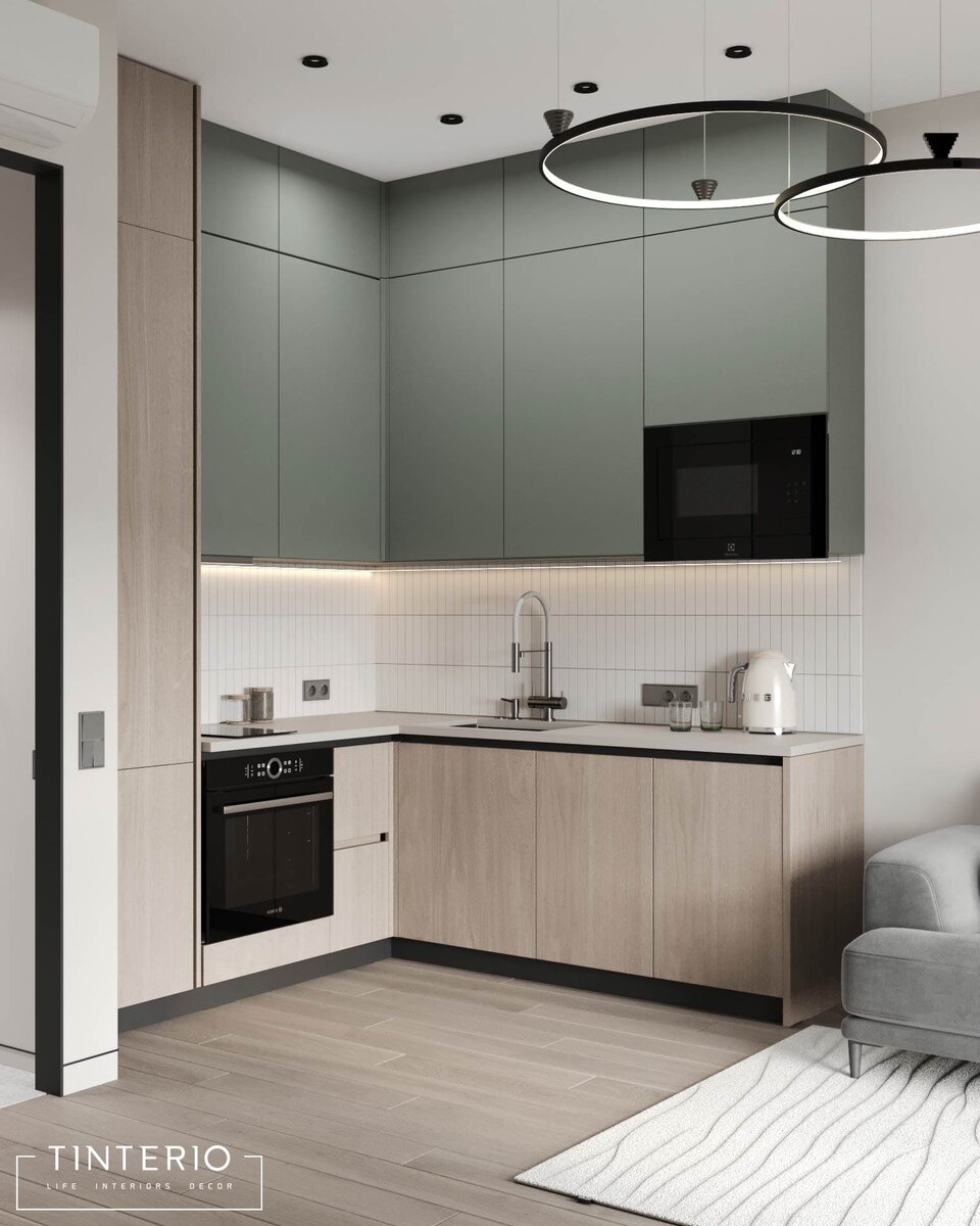 Компактные апартаменты для молодой пары Самое важное для нашей компании – создание комфортного пространства, которое станет уютным домом для всей семьи. Квартира состоит из кухни-гостиной, спальни, технической и ванной комнат. Дизайн выполнен в стиле неоклассики, с ее парадностью и лаконичностью. Баланс поддерживается за счет мятно-пастельного цвета, сложного, невероятного, чрезвычайно элегантного. Кроме того, взятая палитра сочетает в себе оттенки оливкового, молочного, а также белый и светло-коричневый цвета. Для мебели и декора использовались дерево и мрамор, а для штор, обивки и белья – дышащие натуральные ткани. Кухня-гостиная Пространство кухни органично включено в просторную гостиную: гарнитур и техника располагаются в угловой части комнаты. Навесные шкафы оливкового цвета обрамляют буфет и высокий пенал из светлого дерева. В нижнюю часть рабочего стола встроена индукционная плитка и духовка, вверху расположена микроволновая печь. Дизайн составляет единый ансамбль: вертикальные