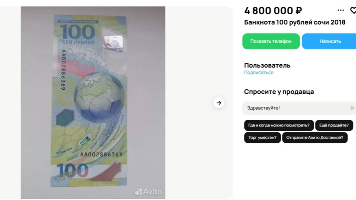 💰Редкую купюру номиналом 100 рублей продают за 4,8 миллиона в Самаре На торговой площадке появилось необычное объявление о продаже коллекционной банкноты. Речь идёт о памятной купюре номиналом 100 рублей, выпущенной к ЧМ-2018 в России. Несмотря на номинал, продавец оценил её в 4,8 млн рублей. По описанию, банкнота новая, не была в обращении и относится к редкой серии «АА». Эти купюры действительно выпускались ограниченным тиражом к футбольному чемпионату и считаются коллекционными. Однако запрашиваемая цена в десятки тысяч раз превышает номинал и даже рыночную стоимость таких банкнот, которые обычно продаются за несколько тысяч рублей. 📸: Авито
