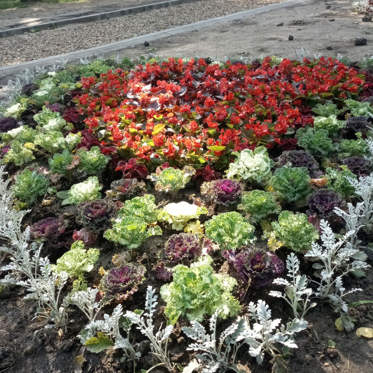 Интересное решение украшения городских клумб. Эта клумба в парке "Юбилейный" привлекла моё внимание своей оригинальностью. А что? Посадили цветную капусту и красиво и урожай по осени собрать можно😂 Нууу, про урожай это я конечно сильно сказала😁, но что красиво - это точно!