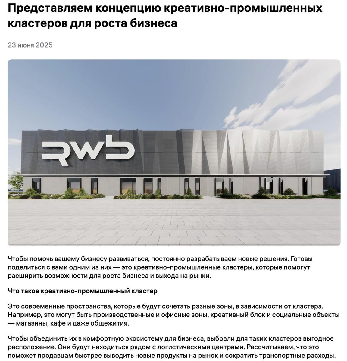 ⚡️ Креативно-промышленые лагеря кластера на ВБ! ВБ не перестает удивлять конечно. Аналог трудовых и производственных лагерей из СССР😂 ⁉️ В чем преимущества кластеров? В таких зданиях мы сможем разместить своё производство, офис или фулфилмент Планируются даже кафе, магазины и общежития! На данный момент, это только концепция и условий сотрудничества пока нет, но заявку оставить можно 🏘 Где планируют открыться? - в особой экономической зоне «Максимиха» в Московской области «РВБ Долина» - Краснодар «РВБ Промпарк» - Иваново «РВБ Пространство» Вы верите, что такие центры станут реальностью? Или все останется на уровне концепции?