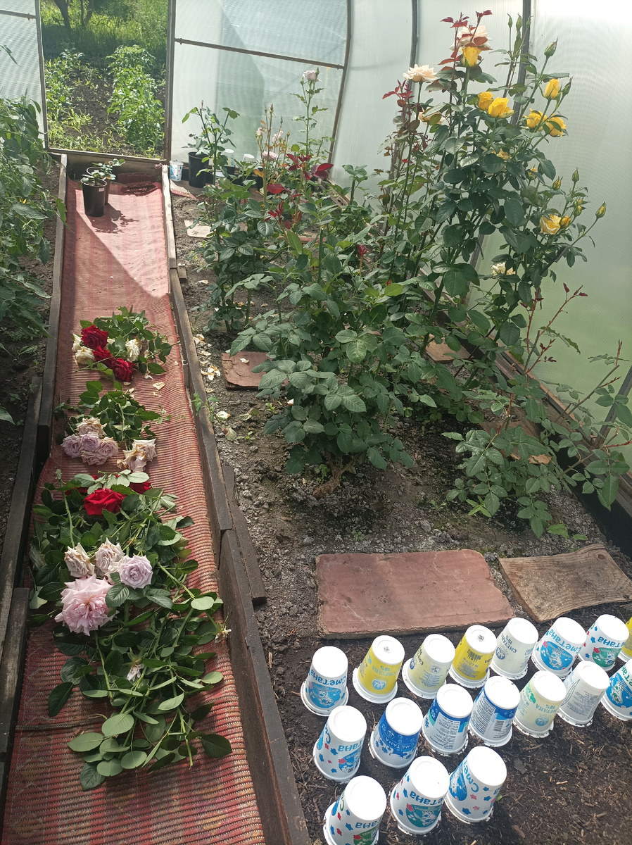 Почти отцвели розы в теплице. 3 недели я любовалась ни с чем не сравнимой красотой, пришло время позаботиться о моих королевах. 22 июня я обрезала отцветшие кусты. 2 фото листайте Получилось целое ведро вполне ещё пригодных для ваз цветков и несколько дней можно на них полюбоваться. Обрезку делала для молодых роз двухлеток щадящую. У них обрезала все боковые отцветшие побеги до сильной наружной почки. Для старших роз обрезка было более жесткая. Они, как правило, на базальных побегах дают много сильных и длинных боковых побегов, на которых потом цветут. Все эти развилки я вырезала до наружной почки на основном побеге. Если этого не сделать и оставить все развилки, кусты ко второму цветению вырастут высоченные и загущенные. Цветение если и наступит раньше, но сами цветки будут мельче. А вот после второго цветения я буду резать по минимуму, чтобы розы успели процвести по третьему кругу. Некоторые кусты уже пробудили верхние боковые спящие почки и даже побежки молодые отросли. Цветки на