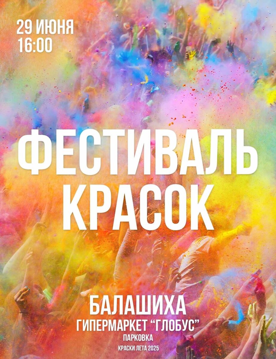 🆓Фестиваль красок в Балашихе! 🗓️29 июня в 16:00 📍гипермаркет "Глобус" 🆓Бесплатно Подробнее ЗДЕСЬ 👨👩👧👦 @Together_with_kids Пост носит информационный характер