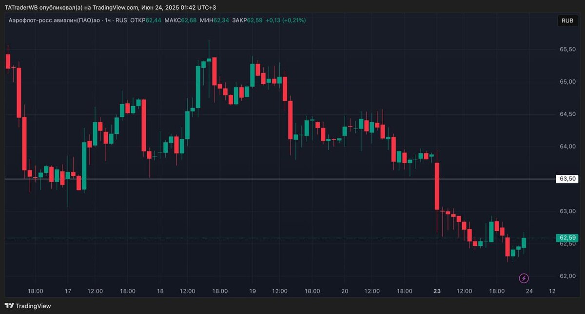 👉 Вчера, на вечерней торговой сессии нефть слили, после чего и ММВБ пошел следом за ней. В итоге открытие основной торговой сессии сегодня планируется с гэпом вниз. Поэтому шортить на продолжение движения НЕ стану. Если смотреть сегодня шорты, то только от сопротивлений, на задерге. Следовательно: $AFLT Планирую присмотреть шорт на отскок от 63,5. (Вход могу взять в диапазоне 63,25 - 63,5) ❗️ Стоп поставлю 0,5%. Тейк +1-1,5% При достижении +0,5% поставлю стоп в без убыток. Желательно, чтобы акция пришла первичным движением к уровню сопротивления! НЕ призыв к действию! Больше идей в Базе. ВНИМАНИЕ!!! Это условия торговли, то есть ЕСЛИ Аэрофлот придет к уровню, зайду. НЕ придет, НЕ зайду!!! Могут выйти новости, это остается доп риском и это НЕВОЗМОЖНО спрогнозировать! Торгую ТОЛЬКО первое касание! 🤝