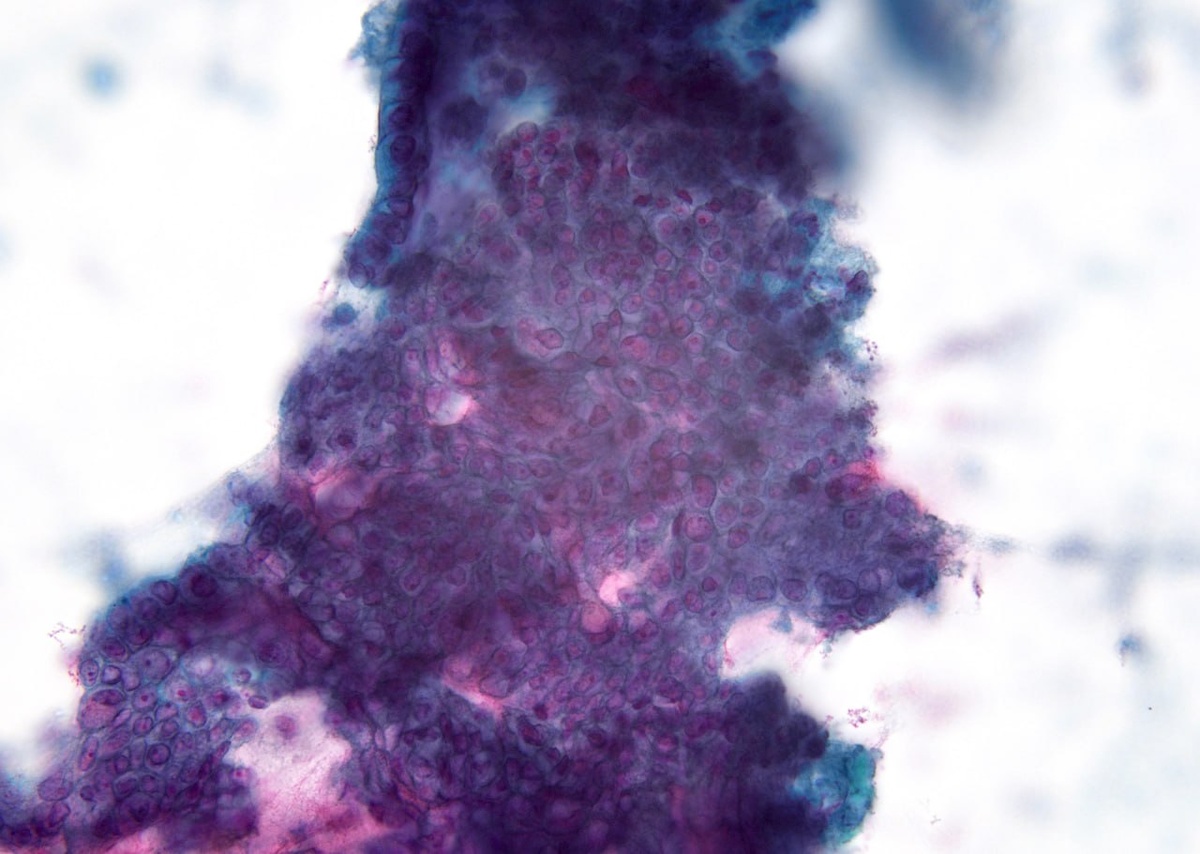 Материал тонкоигольной аспирационной биопсии под контролем эндоскопического ультразвука (EUS-FNA). Окрашивание по Папаниколау. Объектив 60x.