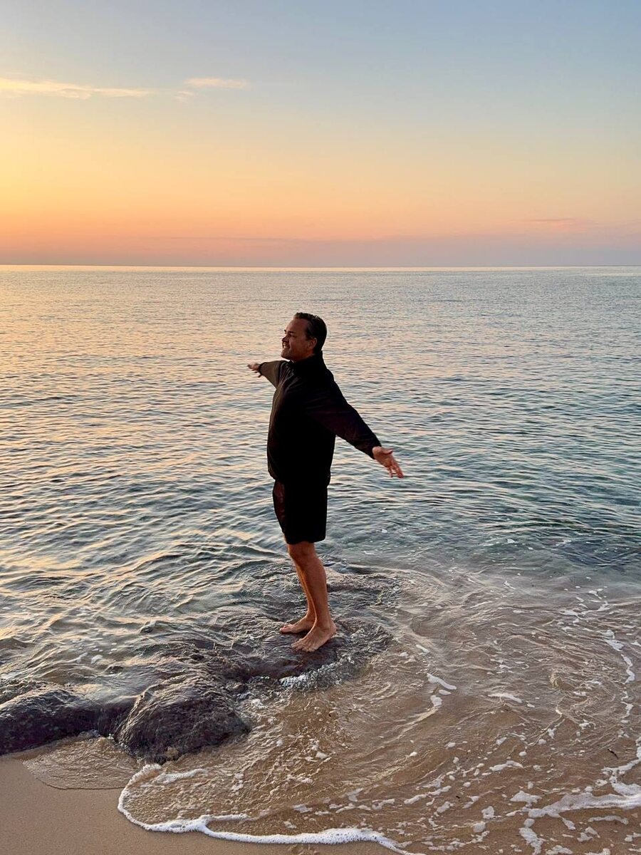 Холодный с утра песок утекал из-под пяток. Волны лизали ступни, отступали и снова возвращались, как будто звали за собой. В этой минуте не было ни прошлого, ни будущего — только я, босой, на границе двух стихий, и рассветное небо над головой. Казалось, если просто стоять так, не шелохнувшись, можно раствориться в этом свете, стать частью утра, частью горизонта, где море целует небо и меня 📍 Forte Village Resort - Hotel Le Dune, Сардиния 🇮🇹 #МояСардиния с Á la Carte Premium