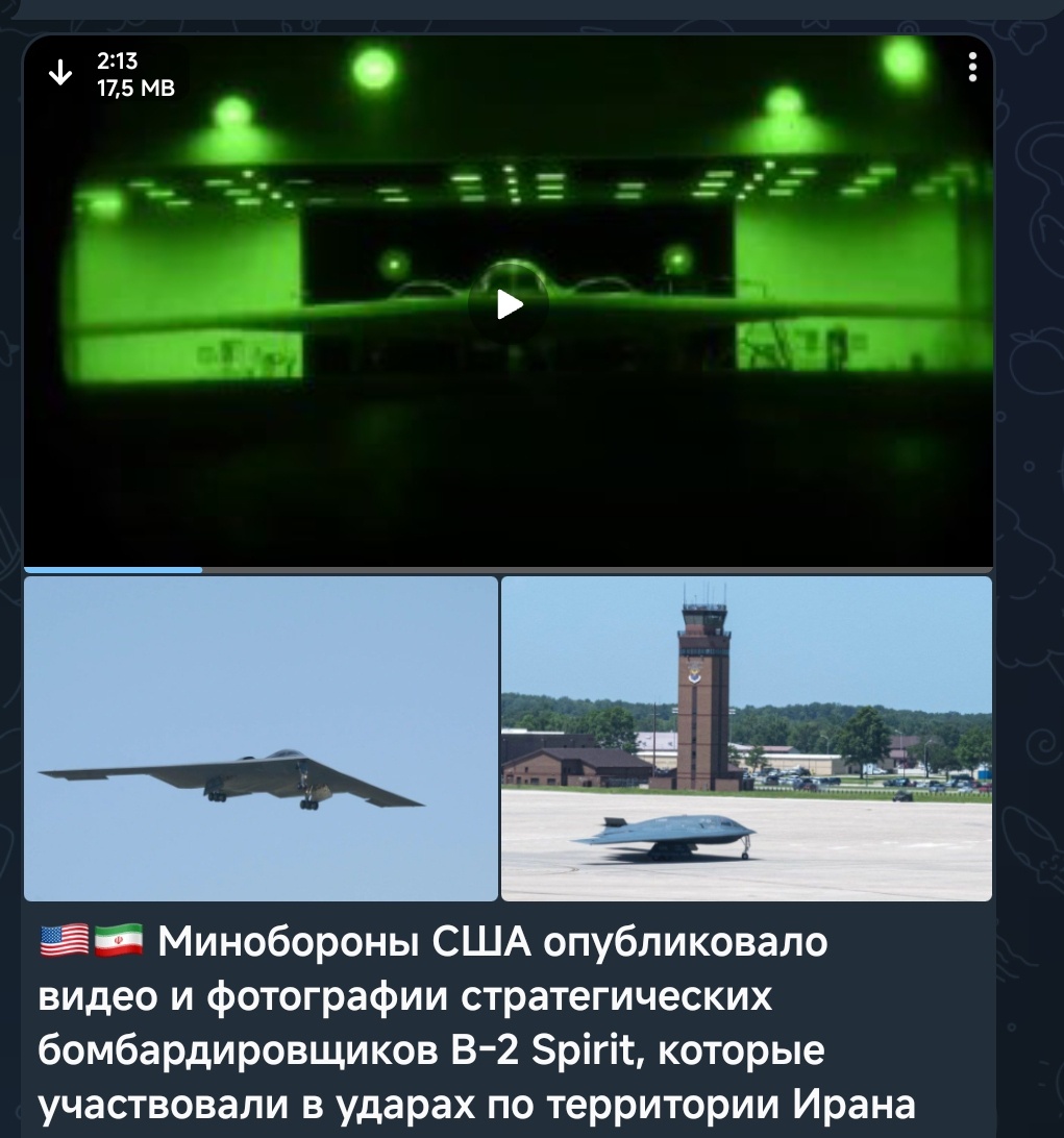 В выходные США нанесли удар по иранским ядерным объектам самым дорогим и технологичным оружием 20 века бомбардировщиком В 2 Spirit. Это самый дорогой ударный самолет в мире! Каждый такой самолет обошёлся казне США примерно в 1,5 млрд долларов. Создали его в конце двадцатого века. Он является символом технологического превосходства США. Ну или символизировал в прошлом. Пока что ни чего нового и прорывного (в сравнении с этим бомбардировщиком) не сделали. Произведено было 21 экземпляр. В строю осталось их меньше. Очень технологичный самолет. Одна из аварий была связана с нарушением подготовки к полету самолета. Перед вылетом на самолете не было включено оборудование по удалению конденсата. Это привело к аварии в воздухе. Самолет не так много где участвовал в боевых действиях. Участвовал в агрессии против Югославии и Ирака. В основном стоит на приколе. Трамп решил задействовать эти самолеты против Иранских объектов. Хотя у США есть В 1В и В 52 разных модификаций. Трамп решил видимо показ