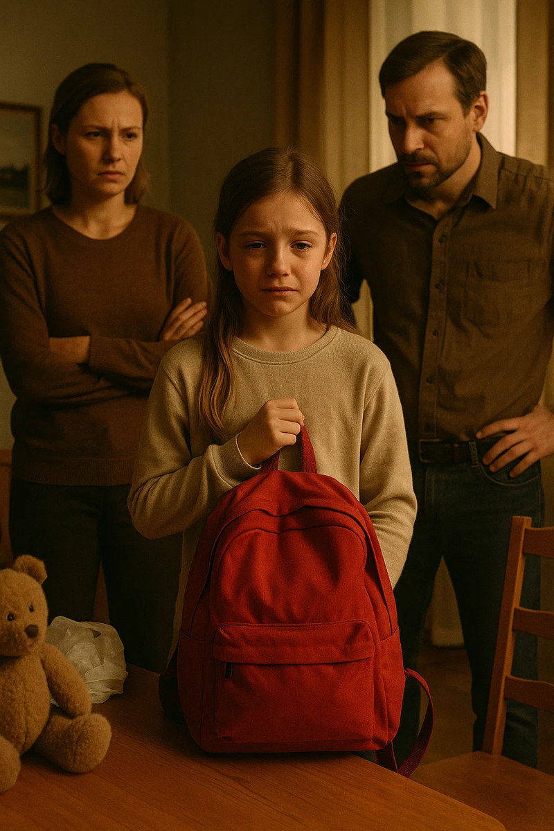 Когда Катя вернулась с прогулки, родители уже ждали её в гостиной. Красный рюкзак со всем содержимым стоял на журнальном столике.
