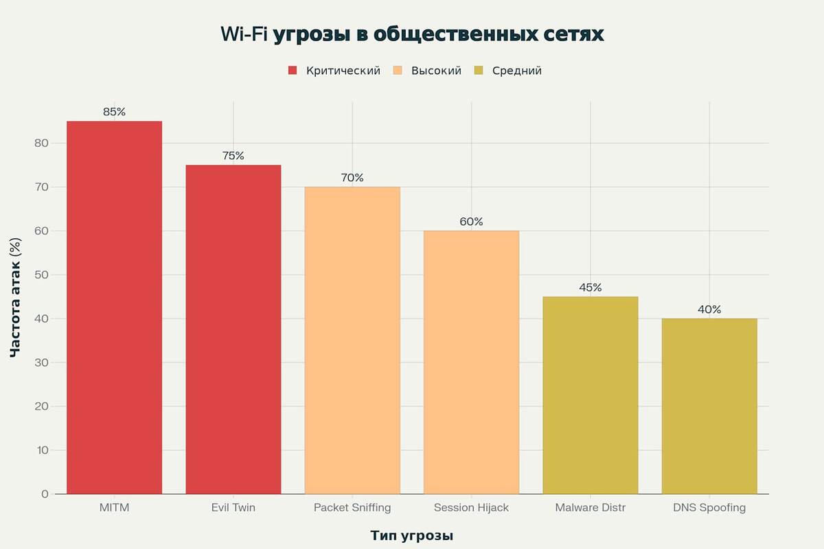 Статистика атак демонстрирует серьёзность ситуации: Man-in-the-Middle атаки составляют 85% всех инцидентов, связанных с общественным Wi-Fi. Эти атаки позволяют злоумышленникам тайно перехватывать и потенциально изменять коммуникации между двумя сторонами. Пользователь при этом полагает, что напрямую общается с веб-сайтом или сервером, но на самом деле хакер ретранслирует информацию, захватывая конфиденциальные данные в процессе.
