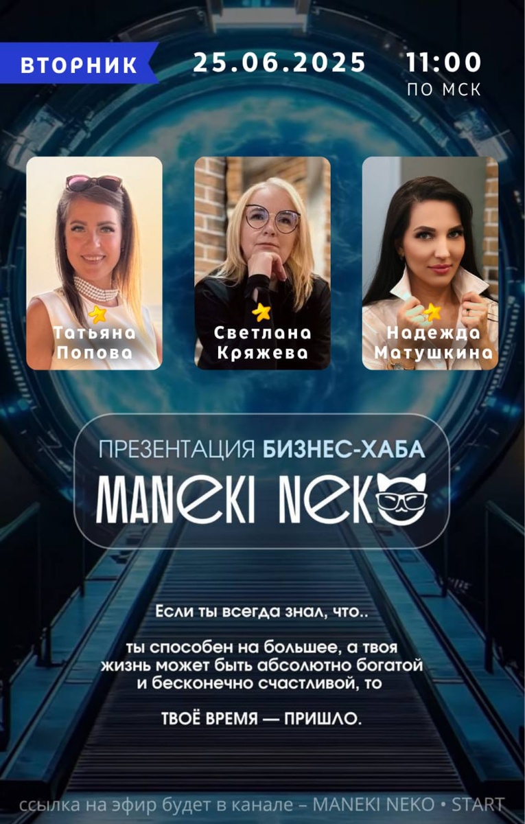 🥵🥵 ВНИМАНИЕ! 💣 Вторник (уже сегодня) 11:00 по МСК Если ты всегда знал, что.. ты способен на большее, а твоя жизнь может быть 🛸 абсолютно богатой и бесконечно счастливой, то ТВОЁ ВРЕМЯ — ПРИШЛО! Онлайн-конференция: БИЗНЕС-ХАБА НОВОГО ПОКОЛЕНИЯ — ПРО ЦЕНТР БУДУЩЕГО И ПЕРЕМЕН 🪩 Спикеры: • Светлана Кряжева • Татьяна Попова • Надежда Матушкина Ссылка на трансляцию будет в официал. канале MANEKI NEKO • START ← Не пропусти — эти 40 минут могут изменить твою жизнь! До встречи! ⚡️