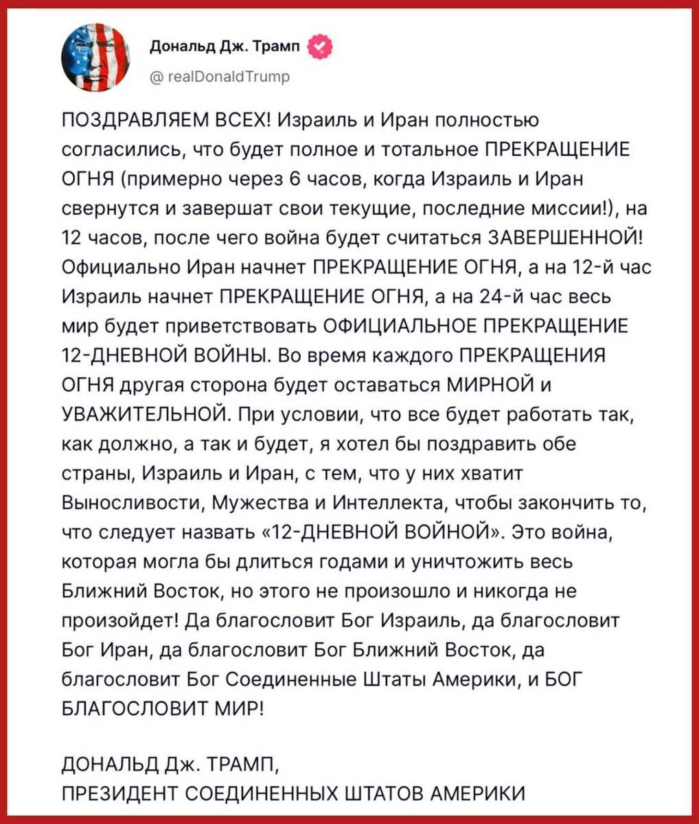 ‼️Заявление Трампа о перемирии между Ираном и Израилем. Главное: Израиль и Иран согласились, что будет полное и всеобщее прекращение огня на 12 часов. Оно начнется примерно через 6 часов, когда Израиль и Иран завершат свои текущие военные миссии. По истечении 24-часового прекращения огня мир увидит "официальное прекращение 12-дневной войны". Трамп также поблагодарил Израиль и Иран за "стойкость, мужество и интеллект", которые позволили завершить "12-дневную войну". США фактически уничтожили ядерную программу Ирана, надеются, что Тегеран не станет ее восстанавливать и это даст шанс на урегулирование, заявил Вэнс. Нобелевка в кармане? Это плохая история. Трамп уверует в силу американского орудия и попытается ударить ещё где-то. Может даже в Украин… Подпишись на Телеграм Александр Семченко