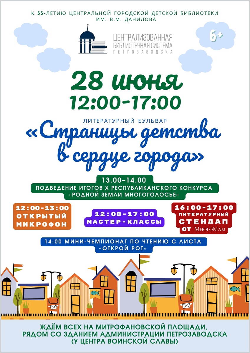 На сайте Централизованной библиотечной системы сообщили, что 28 июня на Митрофановской площади пройдет большой литературный праздник «Страницы детства в сердце города»(6+). Мероприятие посвящено сразу трем датам: 105-летию Карелии, 322-летию Петрозаводска и 55-летию детской библиотеки имени Данилова. Организаторы рассказали, что с 12:00 до 17:00 гостей ждет насыщенная программа. В полдень начнется открытый микрофон, где местные поэты и актеры будут читать произведения о родном крае. В 13:00 подведут итоги литературного конкурса «Родной земли многоголосье», а в 14:00 стартует чемпионат по чтению вслух «Открой рот». Завершит программу в 16:00 литературный стендап от клуба «МногоМам» с юмористическими историями о книгах и чтении. Также сообщили, что на площадке будет работать книгообмен с детской литературой, книжные магазины и мастер-классы для детей. Участников порадуют призами.