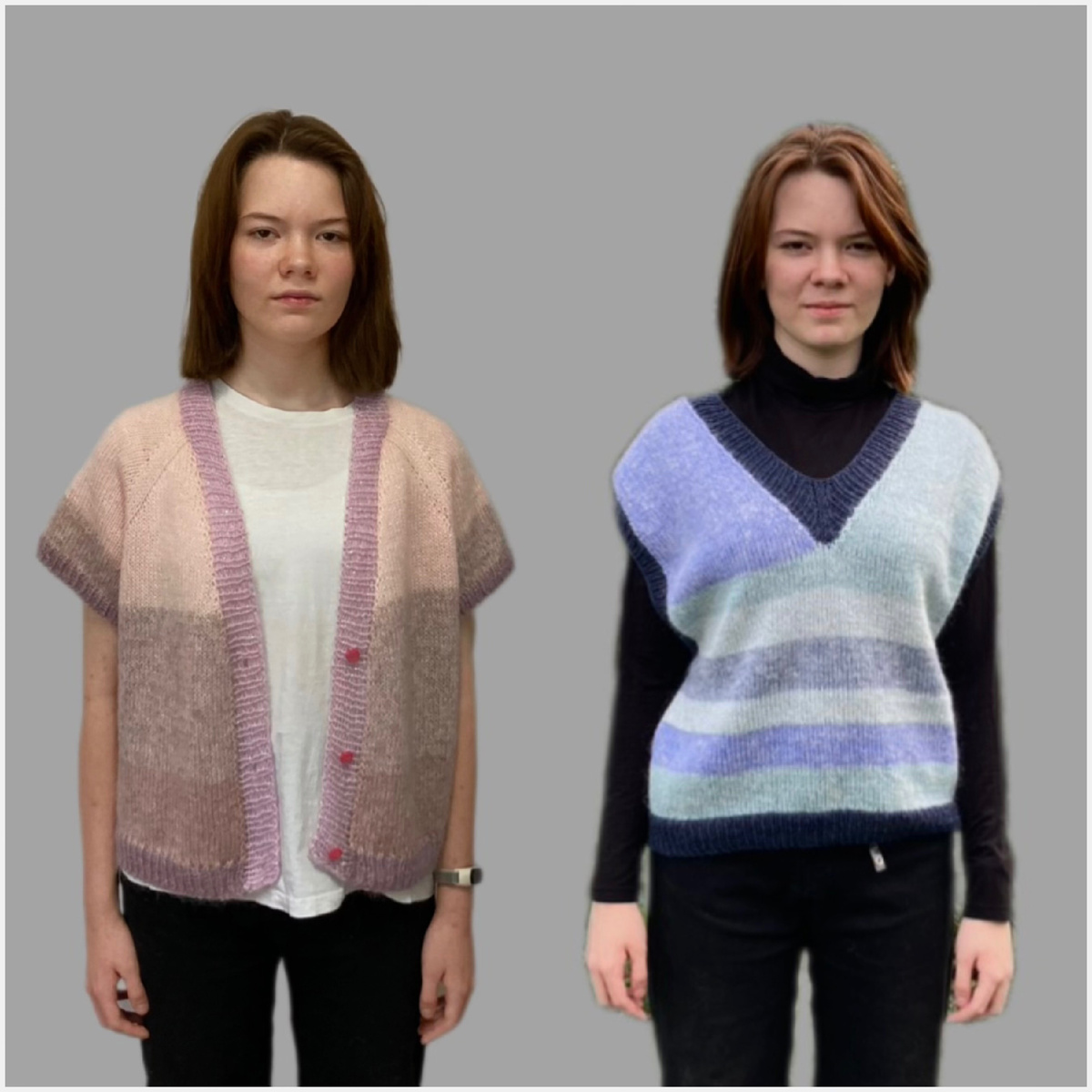 Два разных плечевых изделия! Две разных техники вязания! Разный номер спиц! Объединяет эти изделия только состав пряжи 😉 и размер изделия. Сейчас отправлю маме, интересно, что она скажет 😉