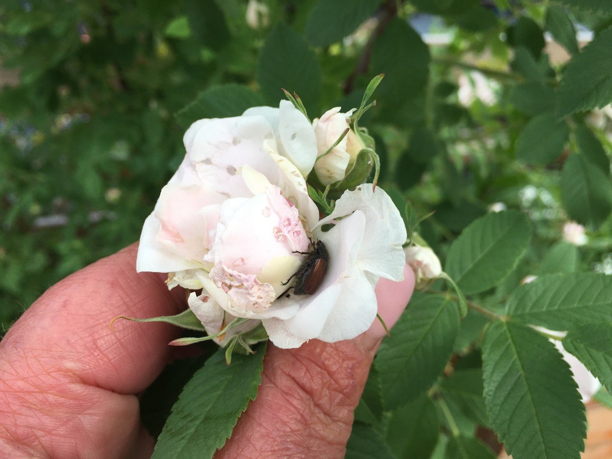 Все выходные каждое мое утро начиналось одинаково – я с банкой собирала бронзовку и хрущиков на розах. Эти противные жуки попортили все цветение первой волны на Ритаусме, которая должна была буквально волной цвести. Но, увы… Вид у нее сейчас удручающий. Самое интересное, что бронзовка не села на другие розы, которые не белого, а красного и розового цвета и не так ароматны, а выгрыз серединки только у этой розы-ругозы. Оставил немного красоты. Хоть другими розочками полюбуюсь. Но как же жалко, что не случилось этого чуда, когда полностью покрытая бутонами Ритусма в один миг раскрывает свои лепестки. Всегда считала, что бронзовка – более южный вредитель. Наши сибирские морозы – отличный заградитель для этого жука. Но видимо последняя теплая зима позволила перезимовать личинкам и вот тебе и пожалуйста, жрёт, зараза, мои розы! Заполучить личинку бронзовки можно откуда угодно. С грунтом в розах или гортензиях, если заказывали что-то в интернет-магазинах, например. А может быть бронзовка сам