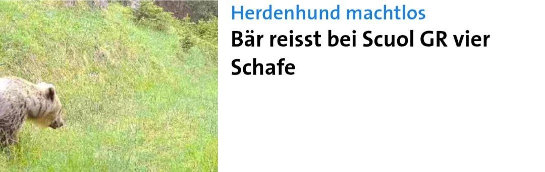 📌 " Медведь убил четырех овец в Нижнем Энгадине, в Валь-С-Шарле, недалеко от Скуоль-ГР. Это первое нападение на домашний скот за последние четыре года, как подтвердил сегодня Арно Пуоргер, руководитель отдела крупных плотоядных.