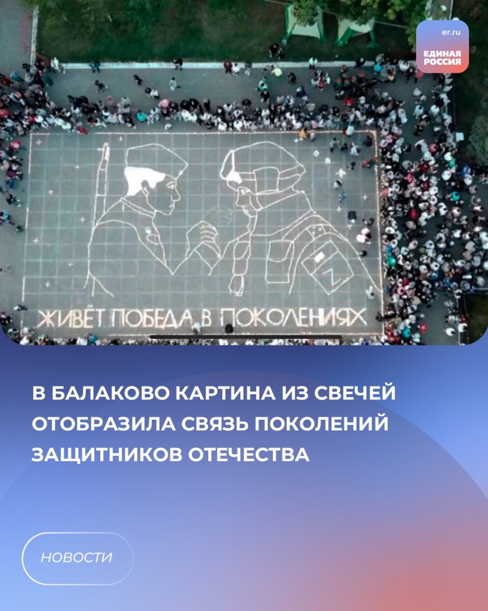 ✅Картина «Связь поколений» представляет рукопожатие советского солдата и солдата СВО. В Балаково накануне Дня памяти и скорби прошла традиционная акция «Свеча памяти». В числе её организаторов - Балаковское отделение партии «Единая Россия». В этом году из свечей была выложена картина «Связь поколений», представляющая рукопожатие советского солдата и солдата СВО. 💬«В год 80-летия Победы мы решили отобразить на картине связь поколений участников Великой Отечественной войны и наших Героев, которые сейчас защищают страну в ходе специальной военной операции. Внуки и правнуки победителей, сражающиеся в зоне СВО с фашистским режимом, продолжают дело своих дедов и прадедов. Среди них немало жителей Балаково. Спасибо всем партнерам акции и огромная благодарность всем жителям, которые пришли и зажгли свечи в память о событиях 22 июня 1941 года. Мы помним и будем передавать эту память из поколения в поколение. И мы верим, что наши бойцы тоже вернутся из зоны СВО с Победой!» - рассказал депу