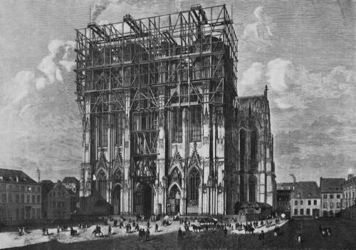 Строительство собора началось с его восточной части. Спустя примерно 70 лет сооружение и отделка хоров были завершены. Возведение собора велось по чертежам его первого архитектора мастера Герхарда. Гильдия каменщиков и плотников, работавшая на строительстве Кёльнского собора с 1248 по 1437 годы, называлась «Братство Святого Иоанна Крестителя». Иоанн Креститель в средние века считался покровителем вольных каменщиков (оперативных масонов). В состав этого Братства входили строители и проектировщики соборов Европы, находивш