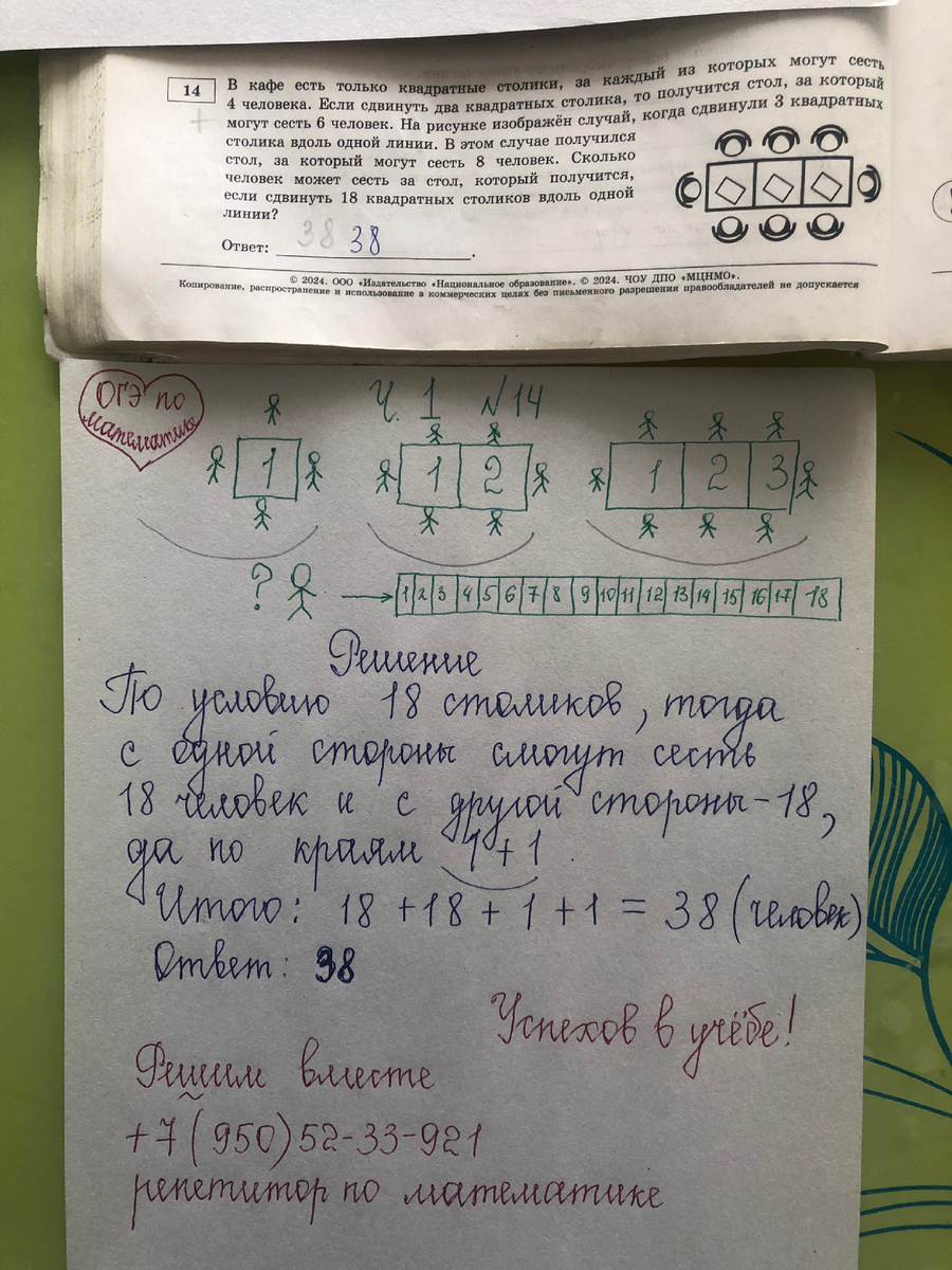 ОГЭ по математике: сколько человек смогут сесть за стол, если сдвинуть 18 квадратных столиков (ч. 1 номер 14)