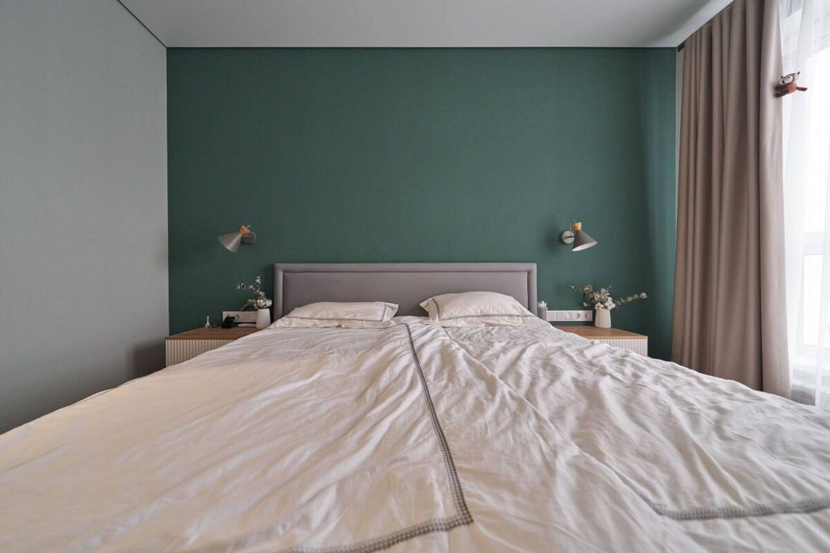 Интерьер этой спальни, реализованный по нашему дизайн-проекту, сочетает сдержанную эстетику скандинавского стиля с деликатными акцентами, создающими атмосферу уюта и тишины. Глубокий зелёный оттенок акцентной стены в изголовье задаёт тон всему пространству, наполняя его ощущением покоя и связи с природой. Мягкое изголовье кровати и подвесные тумбочки по бокам сохраняют визуальную лёгкость, не перегружая интерьер. Пространство напротив занято элегантным туалетным столиком и двумя комодами: один — под телевизор, второй — более узкий и высокий, с растительным узором и деревянной столешницей, словно намёк на ручную работу и внимание к деталям. Панорамное окно оформлено лёгкими занавесками и плотными шторами, которые позволяют регулировать свет, не нарушая гармонии и уединённой атмосферы комнаты.