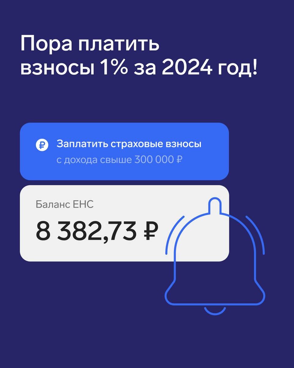 ⚡️1 июля с ЕНС спишется 1% взносов за 2024 Если ваш доход за прошлый год превысил 300 000 ₽, не забудьте перечислить на ЕНС 1% с суммы превышения. Напомним, что это вторая часть взносов ИП. Точную сумму к уплате можно посмотреть в личном кабинете налоговой: ЕНС → раздел «Предстоящие платежи». Ваша задача: убедиться, что к 1 июля на «Переплате» или в «Отложенной переплате» на ЕНС лежит достаточно денег, сами взносы спишутся автоматически.