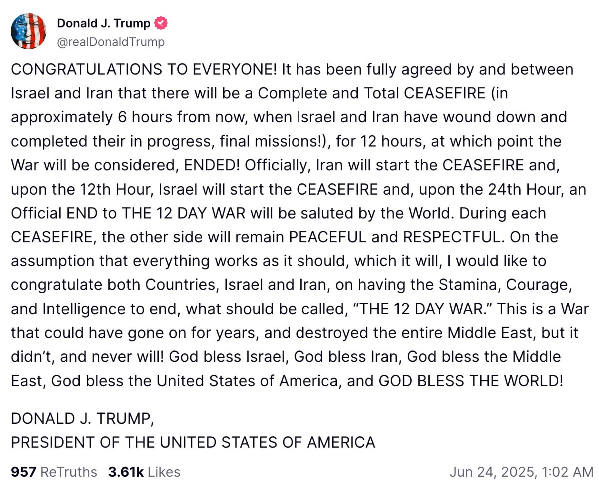 «КОНЕЦ 12-ДНЕВНОЙ ВОЙНЫ», — именно так президент США Дональд Трамп назвал соглашение о прекращении огня между Израилем и Ираном, которое, по его словам, должно вступить в силу через шесть часов, когда обе стороны завершат свои текущие миссии. Сначала огонь прекратит Иран, спустя 12 часов к нему присоединится Израиль. На 24-м часу перемирия планируется завершение 12-дневной войны Министр иностранных дел Ирана Аракчи заявил, что никакого формального соглашения пока не существует, «Однако, при условии, что израильский режим прекратит свою незаконную агрессию против иранского народа не позднее четырех утра по тегеранскому времени, мы не намерены продолжать наш ответ после этого» следите за новостями тут👇👇👇