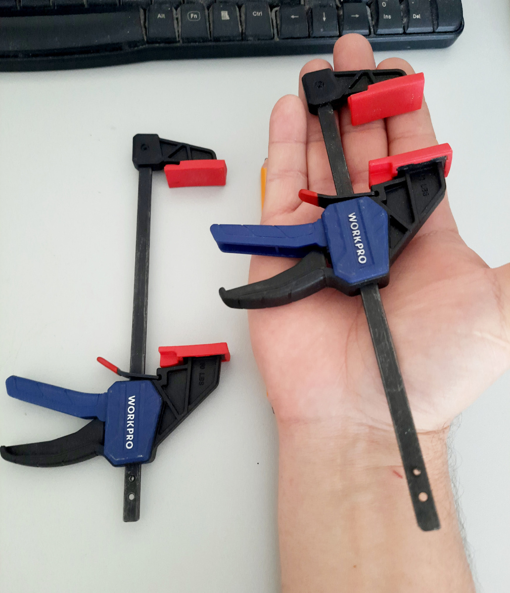 Теперь эти малютки всегда со мной в моей дежурной сумке - дежурного инструмента на выезды по заказам, по установке мебели. Струбцинами очень доволен! Заказал ещё следующую пару модели этого производителя, но уже чуток крупней - 150 мм.