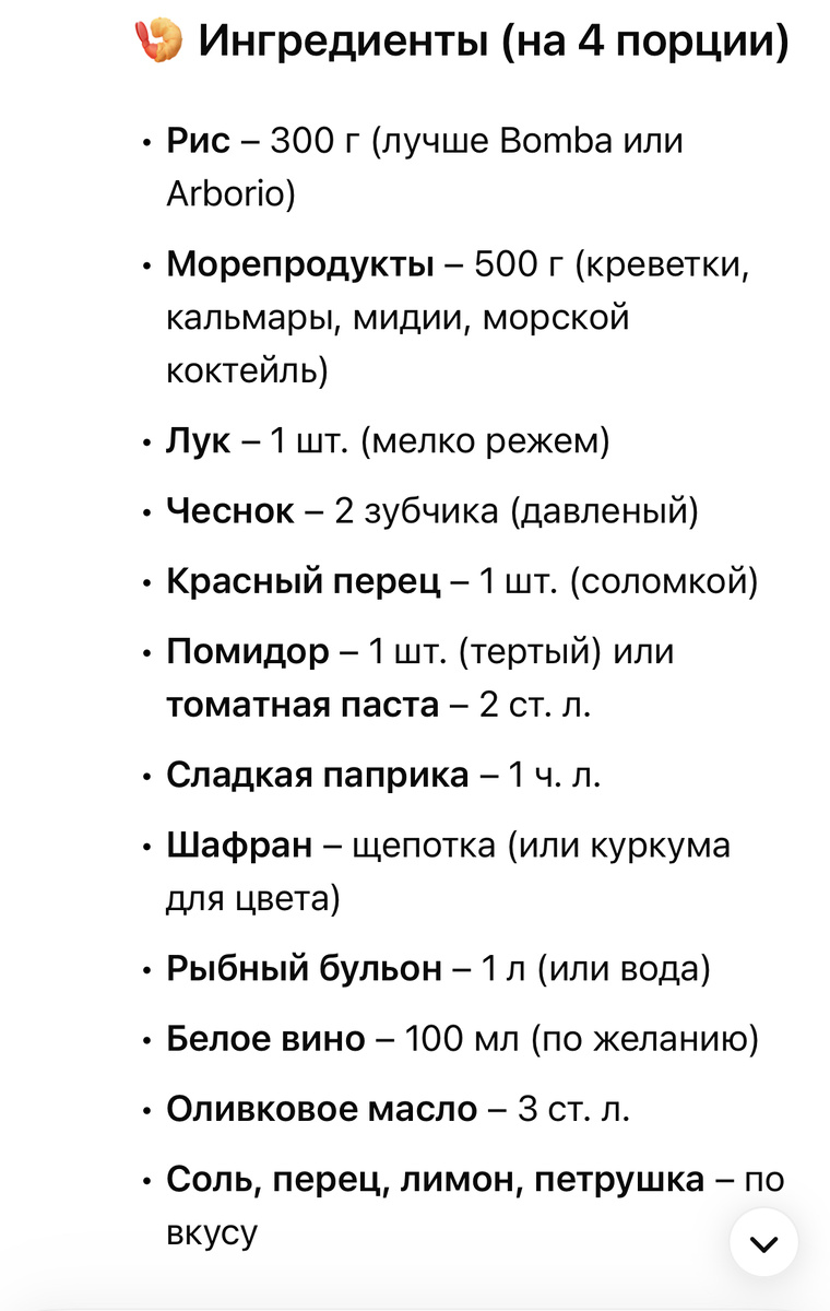 Признаюсь, желание приготовить паэлью появилось у меня гораздо раньше, чем идея устроить средиземноморскую кулинарную неделю. За всю жизнь я не слышала столько восторженных отзывов ни об одном блюде! Это первое, о чем с горящими глазами рассказывают друзья, вернувшись из Испании: «Представляешь, огромная сковорода с золотистым рисом, морепродуктами, ароматом шафрана… Это невероятно!» Чем не идеальный кандидат на хедлайнер моей Кулинарной недели. 🍤 Ингредиенты (на 4 порции) 👩🍳 Пошаговый рецепт 1️⃣ Подготовка морепродуктов Креветки чистим, оставляя хвостики (так красивее!), Кальмары режем кольцами. Мидии промываем (если свежие – бланшируем 2-3 минуты). 2️⃣ Обжариваем овощи -В паэльере (или глубокой сковороде) разогреваем оливковое масло. - Пассеруем лук и чеснок до прозрачности. - Добавляем перец, паприку, тертый помидор (или пасту) – тушим 5 минут. 3️⃣ Добавляем рис и бульон - Вливаем вино (если используем), ждём, пока алкоголь выпарится. - Засыпаем рис, добавляем ша