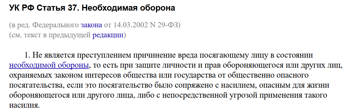 Не так давно в юридических институтах учили, что лучший способ самозащиты - это сдаться, так как статья 37 Уголовного кодекса РФ попросту не работала.