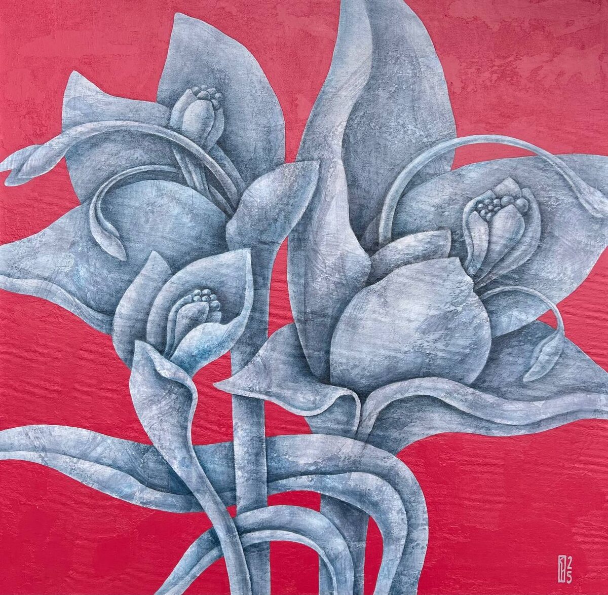 Серебро 60х60 холст/акрил 2025 ••• Наталья Порошина в работе «Серебро» исследует возможности жанра натюрморта в контексте глубокой метафизической живописи. В этой работе цветы находится в каком-то воображаемом измерении, которое ощущается, как вечность. Здесь серебряные цветы — это холодные метафизические объекты, противостоящие красному фону. В этом можно увидеть интересный смысловой ход: фон становится чем-то живым и энергетически наполненным, а типичный образ жизни — цветок — вневременным холодом драгоценного металла. ••• Поразмышлять на тему многозначности летнего цветения можно на выставке «Цветы и лето» до 10 июля 2025. ••• Москва. Ходынский бульвар 20а, с 11:00 до 21:00 ежедневно. Выставка бесплатная, работы продаются. Вся контактная информация на сайте YOLKA.art