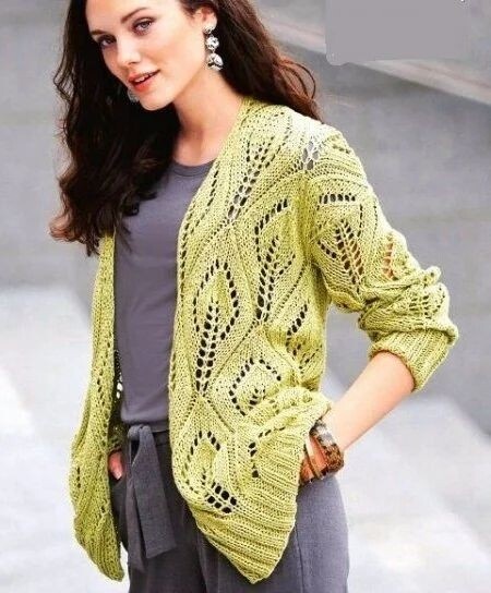 Этот узор с листьями подходит для множества летних, а также осенне-весенних джемперов, жакетов и жилетов. И на фото вы сможете увидеть варианты того, что можно связать с ним. Обратите внимание, здесь 2-3 очень похожих узора и схемы тоже прилагаются. Но от толщины пряжи и номера спиц зависит итоговый размер узора. Где-то листья выглядят огромными, а где-то чуть меньше. Поэтому обязательно свяжите образец из той пряжи, из которой планируете связать свою вещь.