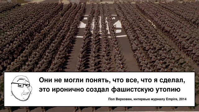 В-третьих, сам Пол, возможно, чуть-чуть перестарался в сатире. По сути, фильм выглядит как пропаганда — красивые актеры, простой сюжет, воодушевляющая история про превозмогание и победу. И все это на фоне стройных солдатских рядов прямиком из «Триумфа воли», черных СС-овских униформ и культа насилия. Никаких тут нет заключенных, которые бы в камеру лили слезы о кровавом режиме: здесь все настолько неплохо, что даже душевые общие, и это разумеется было снято ради посыла, а не ради грудей в кино (которые Пол, судя по «Вспомнить все», явно любит с избытком, хех). А всякие прелести жизни в Федерации, типа суда и казни в один день, гражданства только за военную службу, полиции мысли, открытой ксенофобии, да и подозрительно высокий процент инвалидов среди зрелых людей на экране подаются без единого грамма осуждения. В общем, показанного на экране оказалось достаточно, чтобы некоторые критики, не стесняясь в выражениях, обвинили Верховена в... пропаганде фашизма. «Нас обвиняли... в том, что мы неонацисты!... Они не могли понять, что все, что я сделал, это иронично создал фашистскую утопию» — сокрушался Верховен в 2014-м году в интервью журналу Empire. Возможно, недостаточно иронично, Пол?
