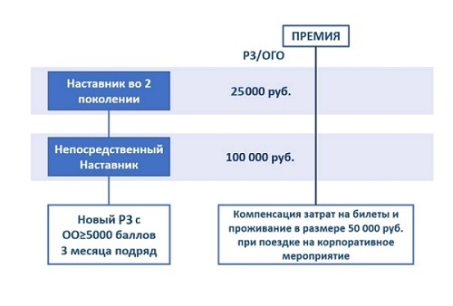 Премия начисляется за новых лидеров, впервые, с мая 2019 г. достигших ранга Р3 и впервые выполнивших ОО ≥ 5 000 баллов. Условием является выполнение данных требований в течение трех месяцев подряд (Р3, ОО ≥ 5000 PV)* * В том случае, если такой лидер на второй или третий месяц не выполнит эти условия, то он сможет принять участие в программе повторно. При этом ему будет необходимо выполнять данные условия 6 месяцев подряд. Участники, чей ОО с мая 2019 года не достигал 2 500 баллов. Кто получает премию: За каждого нового лидера, выполняющего эти условия, двум его наставникам, начисляется премия в размере: * Непосредственный наставник 100 000 руб. *Наставник во 2-м поколении 25 000 руб. *Новый лидер, выполнивший условия, получает компенсацию затрат для поездки и участия в Праздничной Конференции, посвященной дню рождения Компании (транспортные расходы и проживание в отеле) в пределах 50 000 руб. В течение 3-х месяцев Наставники должны выполнять условия ОГО (как минимум на 2-й и 3-й месяц