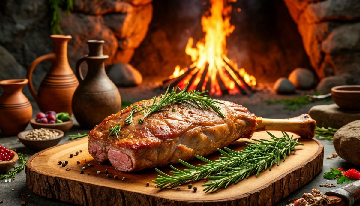 🧂 Ингредиенты (на 4 порции): 2 кг филе мамонта (можно заменить говядиной или бизониной) 3 ст. ложки соли 1 ст. ложка дикого перца (или смесь перцев) 2 головки чеснока 50 мл оливкового масла (или жира мамонта, если найдёте 😉) 1 луковица 1 морковь 2 стебля сельдерея 500 мл красного вина (лучше дикого или домашнего) 1 пучок свежих трав (розмарин, тимьян, петрушка) Древесный уголь для копчения (по желанию) 🔥 Пошаговый рецепт: Шаг 1: Подготовка мяса Выберите крупные куски мяса мамонта (например, оковалок или вырезку). Удалите лишний жир и прожилки. Натрите мясо смесью соли, перца и измельчённого чеснока. Влейте оливковое масло и оставьте мариноваться минимум на 4 часа, лучше на ночь. Шаг 2: Овощная подушка Лук нарежьте полукольцами, морковь — кружочками, сельдерей — брусочками. Выложите овощи на дно большой формы для запекания или костра. Сверху положите мясо. Шаг 3: Заливка Влейте красное вино так, чтобы оно покрывало дно формы. Добавьте измельчённые травы. Шаг 4: Жарка Если использует