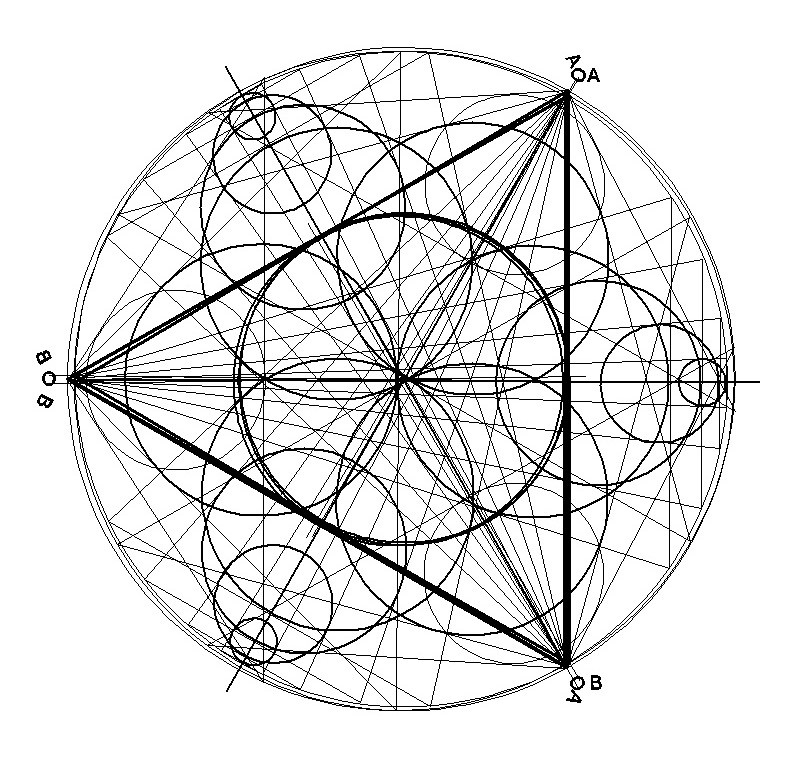 Всем доброго времени! Здравствуйте, друзья. В сегодняшней статье будет не столько текста, сколько картинок. В общем-то, это является неким промежуточным математическим итогом при геометрическом построении плоскости для модели атома. Итак, представим себе, что некая частица в некоей точке находится в покое. Как только состояние покоя частицы нарушается (кстати, квантовые физики эту процедуру называют "измерением"), появляется отрезок, отражающий отклонение частицы от точки покоя. В левом углу равностороннего треугольника наша частица, пусть там будет её точка покоя. Точка 0. При моделировании исходим всего из одного постулата: для любого отрезка в плоскости найдется такая третья точка, что полученная фигура будет являться равносторонним треугольником. Исходя из этого же постулата - эта третья точка имеет свой зеркальный антипод относительно оси, которой является исходный отрезок. Для удобства будем считать, что из точки 0, слева направо, начала движение некая точка "в". Как только межд