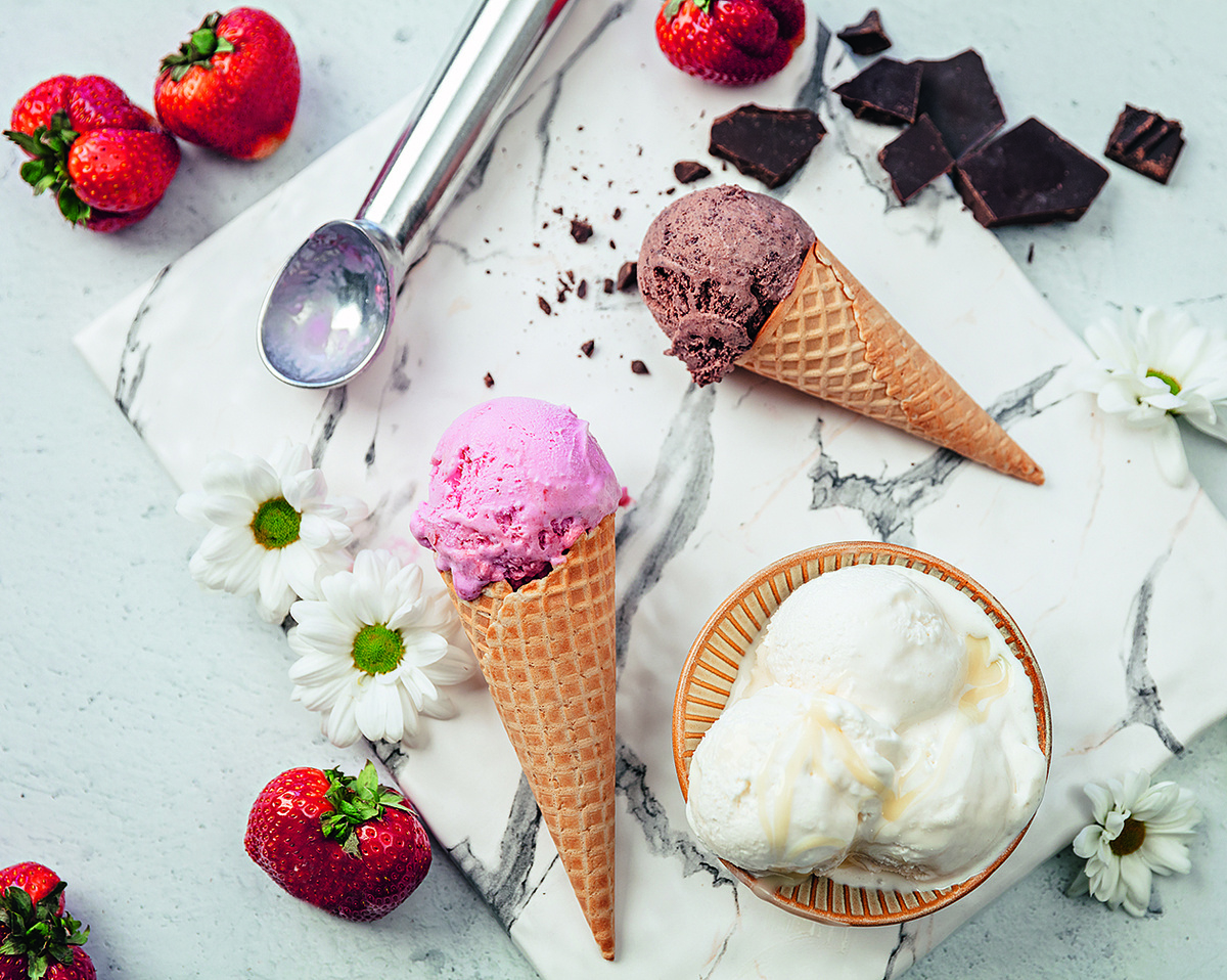 Достаньте, снова взбейте блендером и уберите в холод на 30 минут. Повторите то же самое ещё раз. Подавайте домашнее мороженое в вафельных рожках.