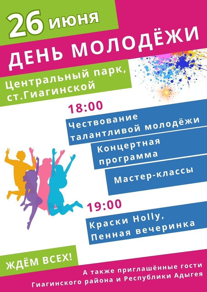 26 июня в Центральном парке ст. Гиагинской в 18:00, состоится праздник для самых ярких, активных, энергичных и креативных представителей нашего района — День молодёжи!